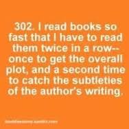 - I think I get more out of audiobooks than print sometimes, because I have this terrible partial-skimming habit when I am reading a really interesting book. I read really quickly if I’m intrigued and I know that I miss parts of books by skimming ahead. I can’t stop myself from doing it, and I definitely do not miss anything extremely important, just minor details/descriptive details but the only way I know to stop is to start reading words aloud in my head. I think that’s why the pace of audiobooks just seems slow to me, but I definitely absorb the entire book. Any tips for stopping this bad habit? I guess I will just rely on re-reading some books that I know I love. I think I might try Harry Potter on audiobook in 2016 because I know I will skim parts of it and I want to get it all in. #fastreaderproblems
