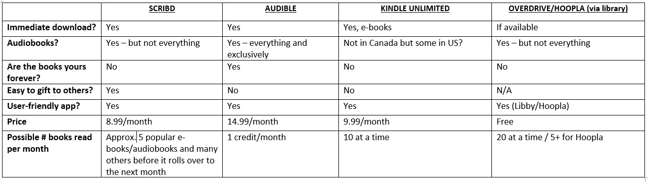 Also, when the books you’ve saved “disappear” and aren’t available until the next month, there are still LOTS of backlist titles you can read. Personally, I think I got through 5 audiobooks the first month before anything became limited and 6 audiobooks and 2 e-books the next month. I don’t see this being an issue if you really prioritize the books you desperately want to read/listen to first and the rest are just gravy on top of that. It’s definitely good to know up-front though and I know that I relied on the library waitlist for a couple of books instead of listening through Scribd just so I could guarantee I’d have access to the Scribd books not available at my library if that makes sense. I’ve made a little chart here that compares Scribd to other e-book/audiobook apps and maybe it lays it out in a more clear way: